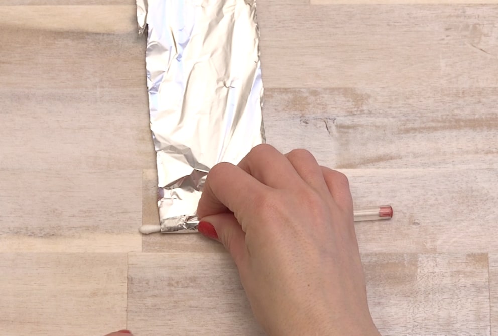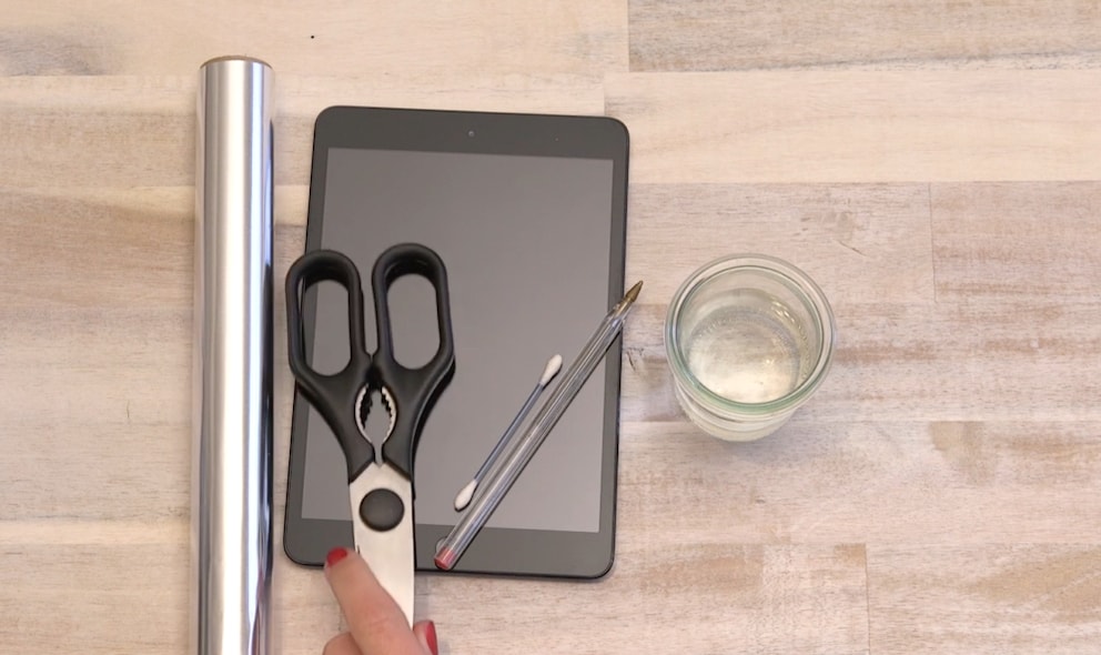 Now wrap the ballpoint pen in aluminum foil. It’s important that the foil also touches the cotton swab at the tip.