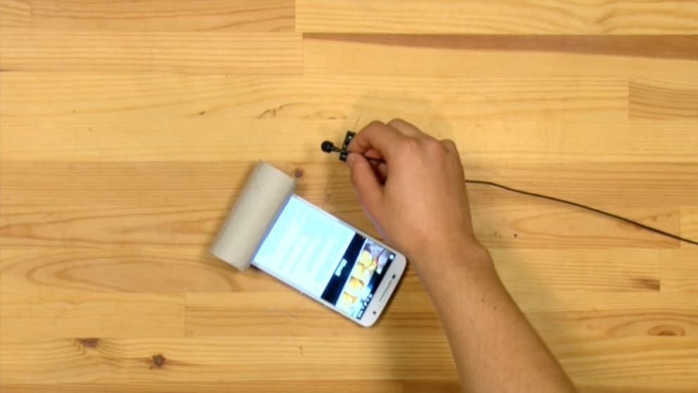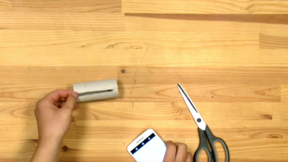 Make a cut in the center of the toilet paper roll and cut a slot approximately the width of the smartphone.