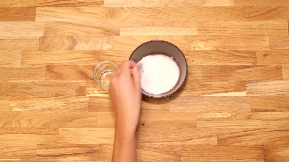 Pour the baking soda into the bowl and add a splash of water. Then stir everything vigorously with the spoon. The liquid should solidify after a short time.