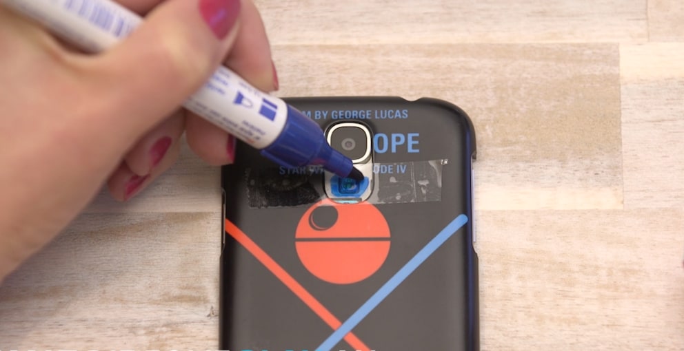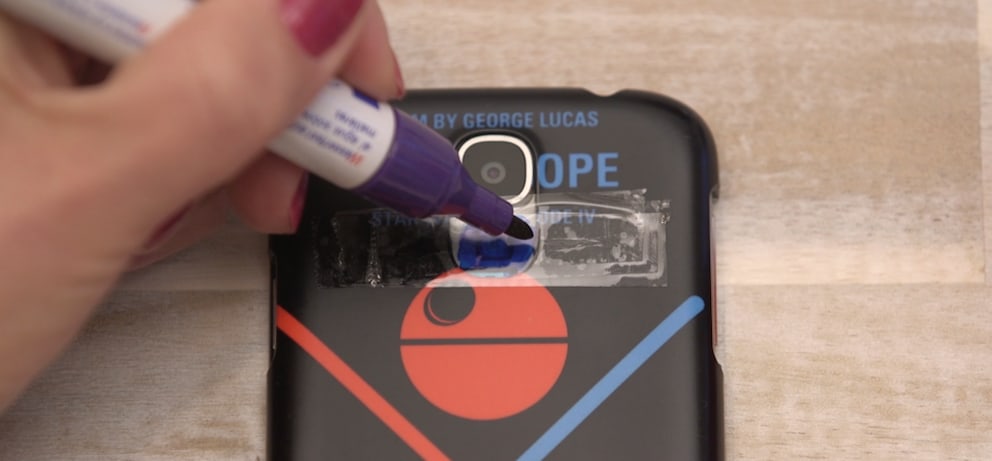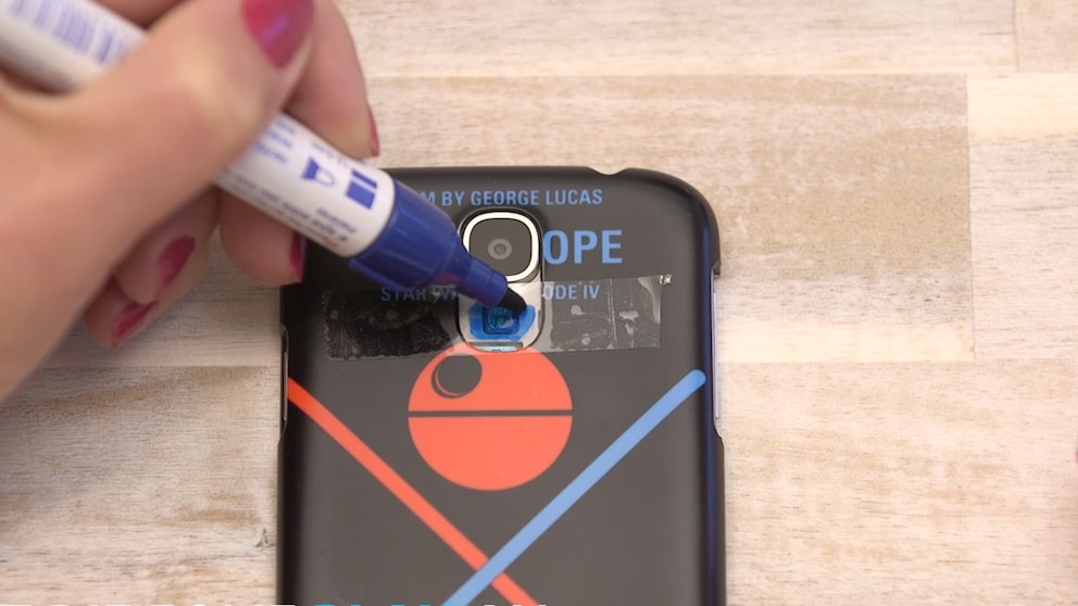 Generously place a strip over your smartphone’s LED light and color the area with the blue marker.